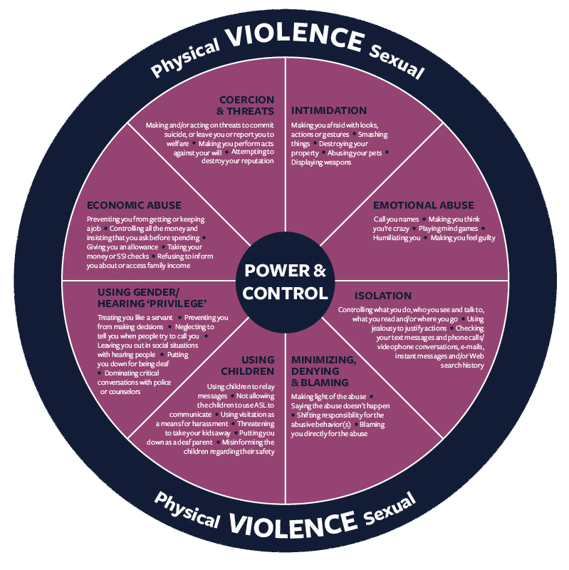 The power and control diagram is a particularly helpful tool in understanding the overall pattern of abusive and violent behaviors, which are used by a batterer to establish and maintain control over his partner. Very often, one or more violent incidents are accompanied by an array of these other types of abuse. They are less easily identified, yet firmly establish a pattern of intimidation and control in the relationship.